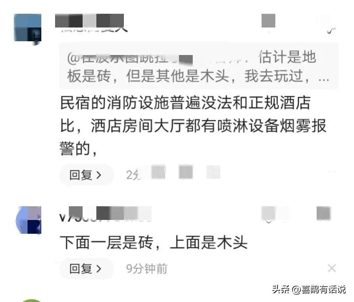 一些网友还透露,正规的酒店房间和大堂都有安装洒水设备烟雾报警。一旦发生火灾,喷水灭火系统会自动开始灭火,可以提醒人们尽快撤离。然而,大部分的民宿的消防设备的灭火系统并不完善。如果它们是由木结构制成的,燃烧时间非常快,逃跑的概率非常低。