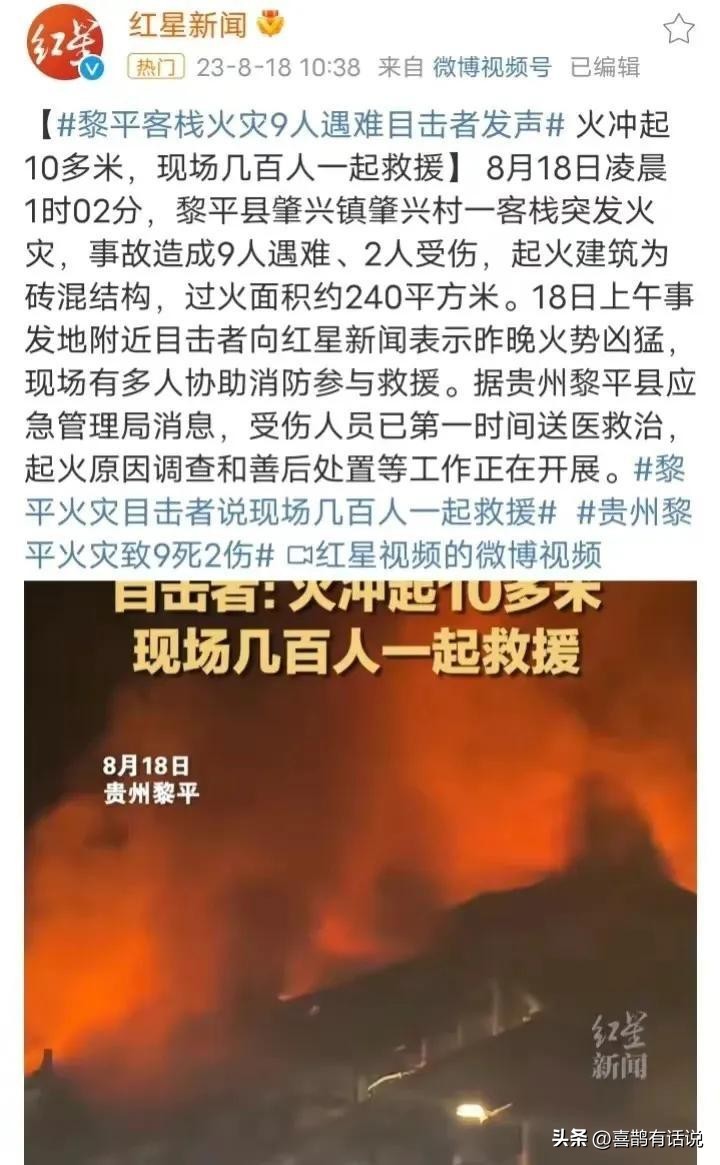 8月18日,贵州发生一起大火,造成重大损失。事发后,当地消防等部门迅速赶赴现场,开展灭火和搜救工作。截止当前,该事故已然造成9人死亡,2人受伤,正在医院接受治疗。