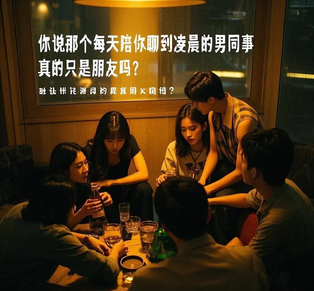 在深夜的酒局上,灯光昏黄地摇曳着,闺蜜突然凑近,轻声问道:“你说,那个每天陪你聊到凌晨的男同事,真的只是朋友吗?”她的眼神里,三分是试探,七分是焦虑,仿佛在探寻一个关乎命运的答案。