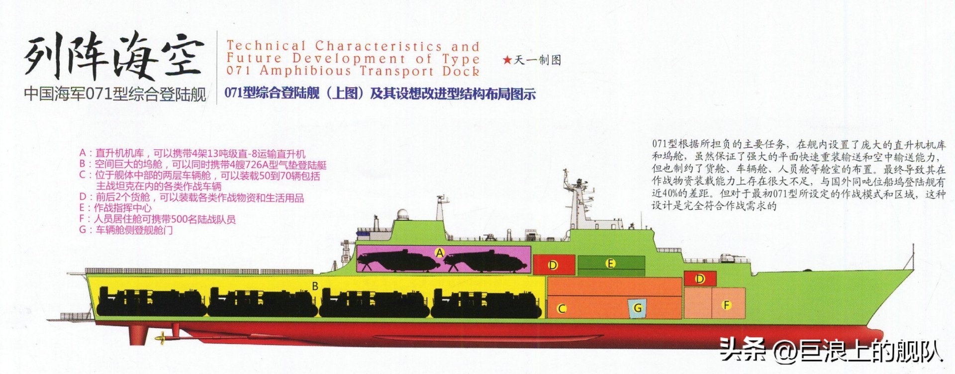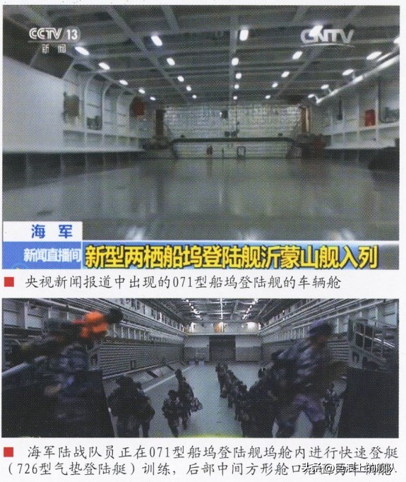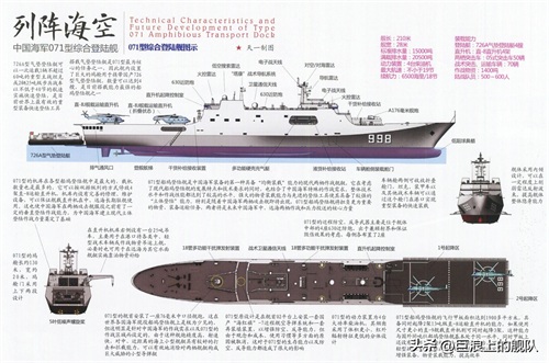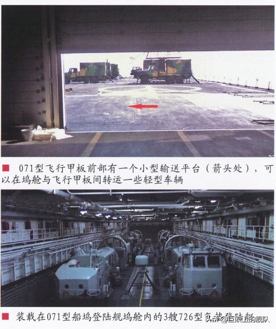 071的舰艏设有横向推进器,在舰尾坞门开启作业时可稳定舰身的平衡。舰体后段设有大型直升机飞行甲板,上层结构末端设置了 一个大型机库,能同时容纳四架直-8等级的大型直升机,而直升机甲板则有两个起降点,可同时起降操作2架直-8型直升机;舰尾设有坞舱 ,长度约占舰长的2/3(约140m),能容纳四艘中国新开发的LCAC气垫登陆艇,此外船艛两侧各可吊挂一艘人员输送艇,舰上可搭载800名登陆部队,舰内车辆甲板可停放主力战车。071的 外型设计也考虑到降低雷达截面积。自卫武装方面,舰艏设有一门PJ-26型76mm快砲(俄罗斯AK-176M的中国仿制版,) , 四具726-4 18联装干扰弹发射器分置于舰首两侧以及上层结构两侧,近迫防御则仰赖四座布置于上层结构的H/PJ-13 30mm防空机砲(俄罗斯AK-630的中国仿制版) 。