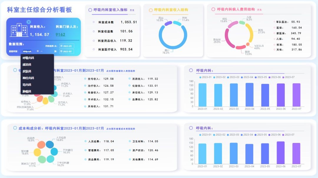 根据管理角色(如院领导、职能部门、临床科室)的不同需求,针对性地展示相关业务主题和指标数据。通过综合统计、多维分析、自定义分析、图文报告、预警预测等多种数据分析手段,对医院业务数据进行深度分析和全面评估,为医院决策提供强有力的数据支持。