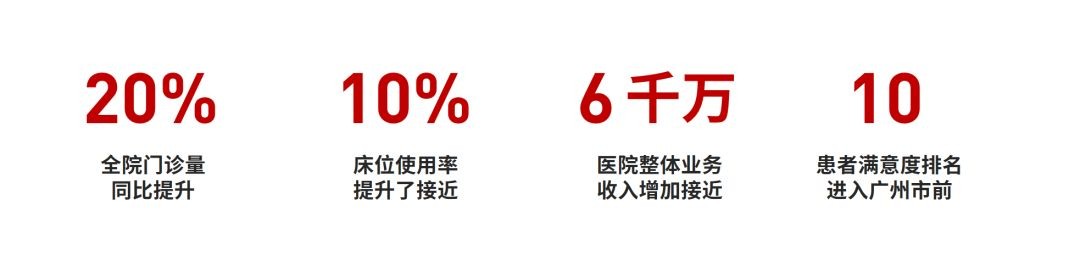 2024年上半年,日均每医生接诊量有效提高,全院门诊量同比提升20%;床位从800张提升到了1500张,床位使用率却提升了接近10%;并且,与2022年相比,2023年的百万元以上设备效益同比增加超过90万;经过三定方案,在全院在职职工人数下降的同时,医院整体业务收入增加接近6千万。同时,医院关注并加强患者服务,使得患者满意度不断提升,满意度排名进入广州市前10。