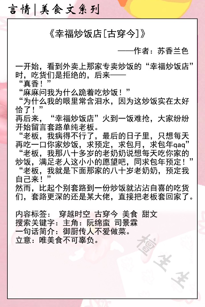 小短评:出身御厨世家,却不爱做菜的女主穿越到现代,继承了一家炒饭店和一大笔债务,为了还债和生存,女主将饭店重新开张,利用现代便利,把位置偏僻的小店改成网上送外卖模式,凭着物美价廉的优势,让自家小店被更多人熟知,进而引来无数吃货来“打卡”的故事。很有食欲的一篇文,男主本来有洁癖,从不碰外食,后来在爷爷巧用美食诱惑下,也迷上了女主家的美食,从此走上了被征服胃后被征服身心的道路……
