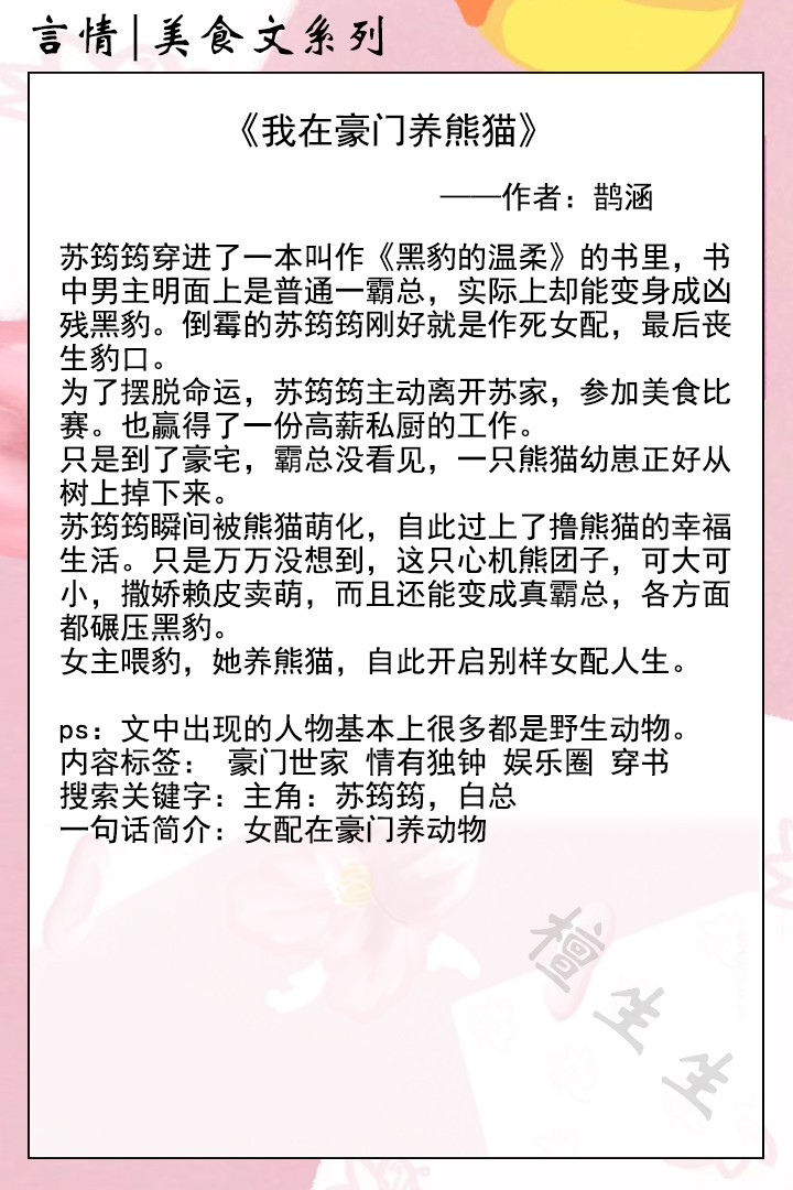 豪门恩怨+美食+萌兽,睡前解压萌文。高颜值,大长腿,可凶可萌,可变熊猫大总裁和 肤白貌美,可变成小狸花猫的厨娘女配的爱情了解下?男主兽体是软萌萌形体很Q的熊猫,个头不大,反正能一屁股坐在女主腿上,摊开肚皮求撸的那种~