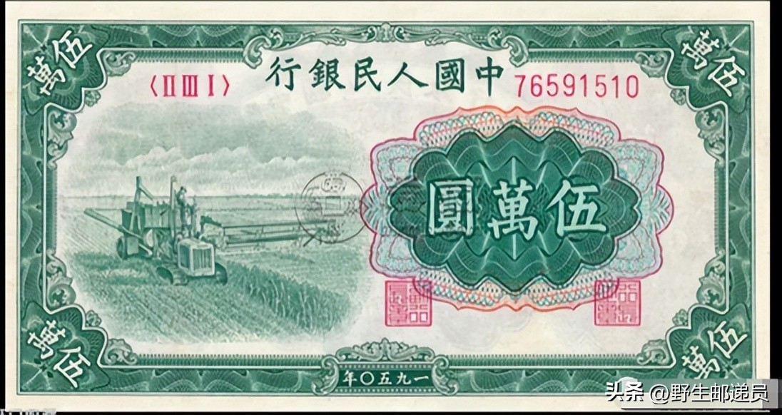 五万元面值收割机也属于我们发行的第一套人民币,五万元面值图案有2种,分别是新华门和收割机。其中收割机纸币1951年12月发行,于1955年4月1日停止流通。是第一套人民币中发行时间最晚,流通时间最短的一款纸币。曾在2019年香港拍卖会上拍出64.8万的价格。