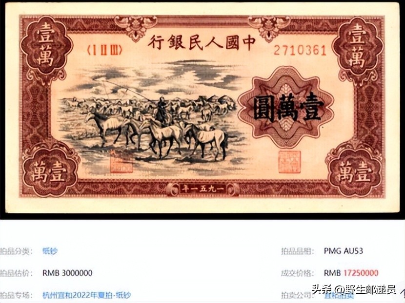 1万元牧马图人民币属于我们发行的第一套人民币,1万元面值图案有4种,分别是骆驼队、牧马、双马耕地和军舰。其中牧马纸币于1951年5月17日发行,并于1955年4月1日停止流通,更是被称为“币王”。因为它是首张拍卖成交额在千万以上的人民币,这是发生在2022年杭州宜和拍卖会上,当时成交价为1725万元。