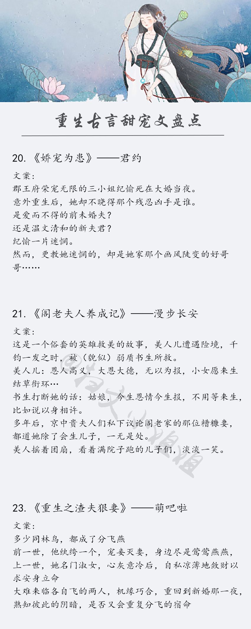 今天,为大家推荐25本精彩的古言重生文,文笔绝佳,都是口碑之作,可放心入坑,喜欢的小可爱一定要收藏起来,慢慢看啊!