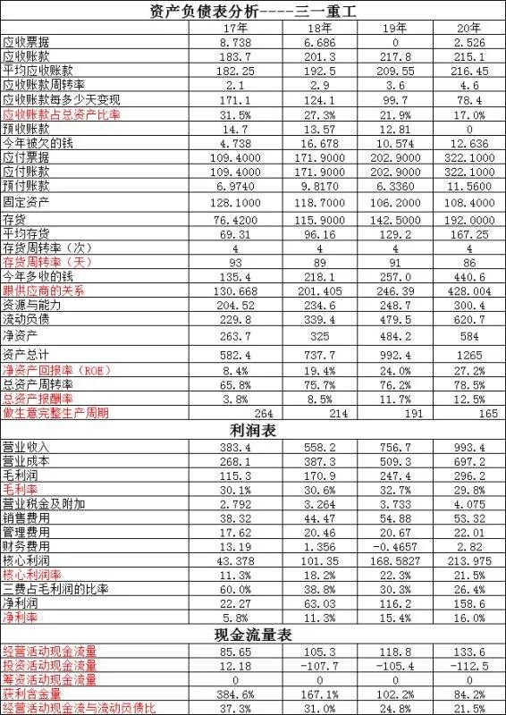 今天一起来看看三一重工和徐工机械,一起来看看他们从17年到20年的财务报表情况(单位:亿)……