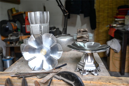 这是制作出来的一个锡盘,犹如一朵盛开的花朵,造型格外别致。在现代社会中锡器已经非常少见了,大多数买去都是为了收藏。