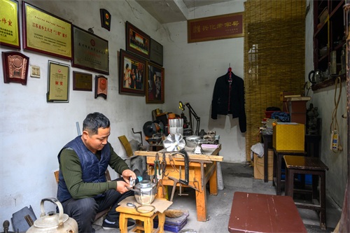 早在古代时,兴化就诞生了诸多的锡匠,尤其是清朝中期,在无锡就有锡匠数百人之多,在这条老街上就看到一家兴化老字号锡器制作店,手艺世代相传并传入到了他的手中,荣获的证书挂满了墙壁,如今这项手工艺已是兴化市非物质文化遗产。