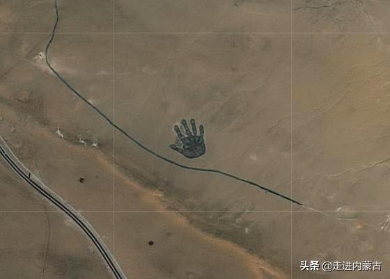 使用卫星地图在内蒙古自治区二连浩特东经约112度,北纬约43度的地方持续放大,可以清晰的看到地图上有一个巨大的手掌印,就像是一个巨大的生物经过的时候所留下的痕迹。