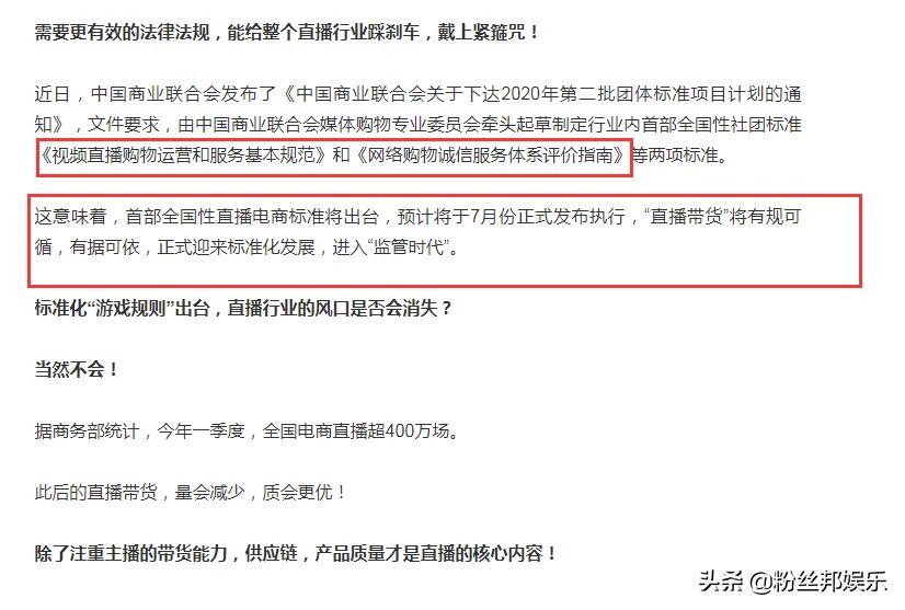 据了电视报报道,直播电商标准将出台,预计将于7月份正式发布执行,“直播带货”将有规可循,有据可依,正式迎来标准化发展,进入“监管时代”。
