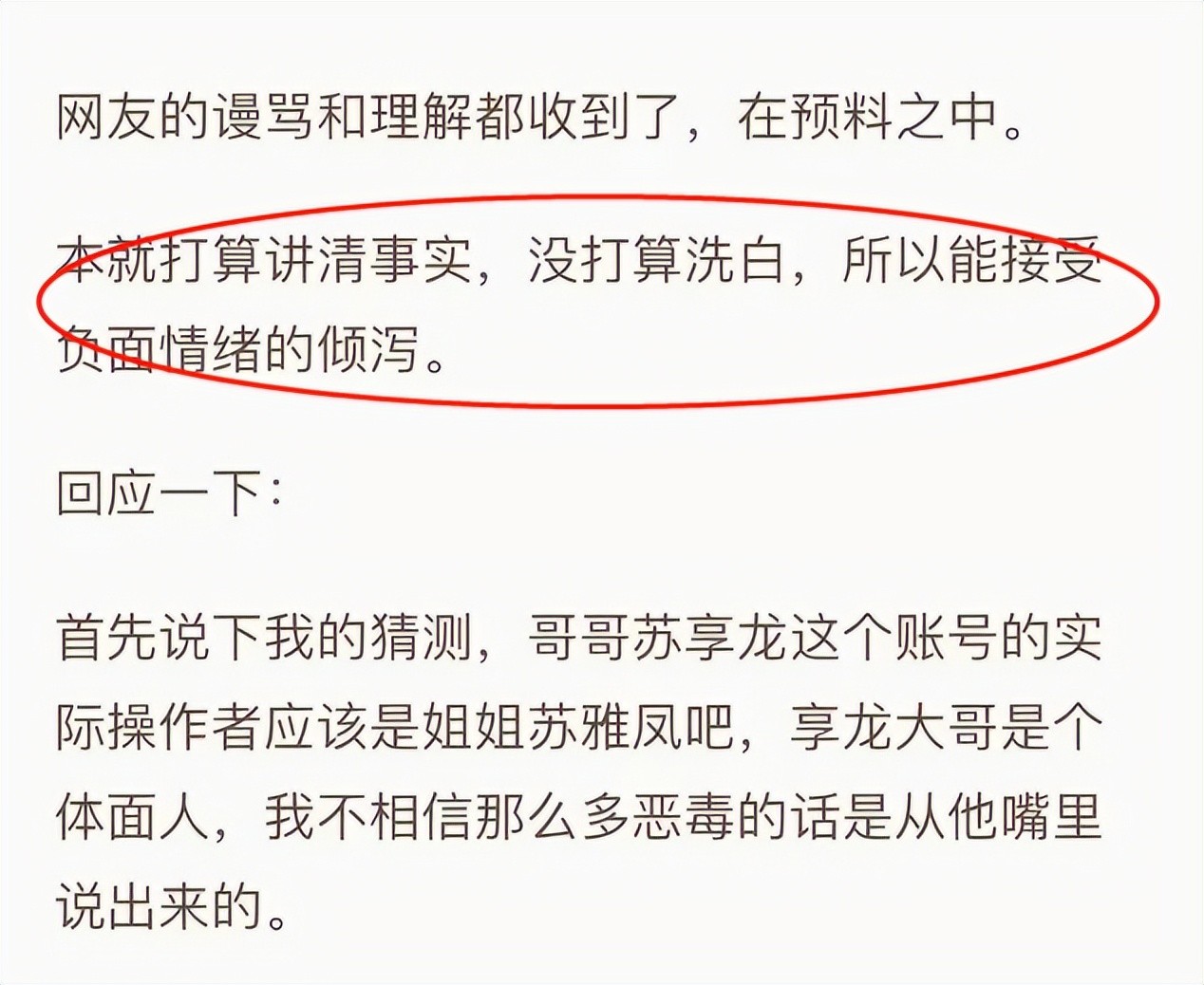 尽管知道自己无发什么都会引来众人的谩骂声,但她还是发布了一篇小作文企图求得苏家人的原谅与放过,并在文章开头说明自己发文的目的并不是想洗白!