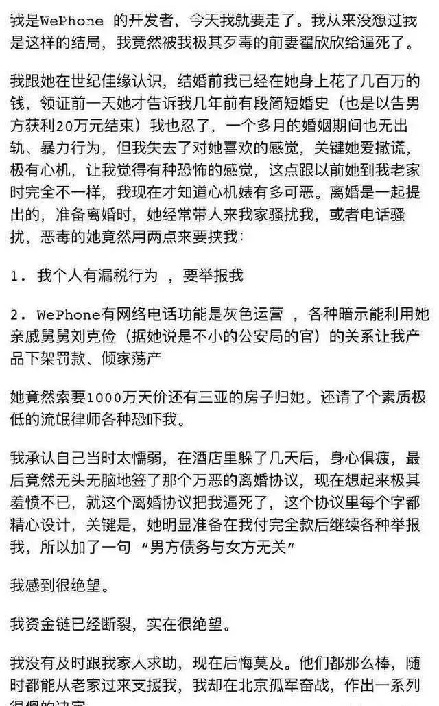 面对吸血鬼一样的翟欣欣,苏享茂在被连环骚扰了三个月之后,亲手写下了一封遗书,文清楚的写出了前妻翟欣欣对其实施的罪行,并将这封遗书发布到了一手研发的APP(wephone)上,随后转身从公司的大楼上一跃而下,终年37岁。