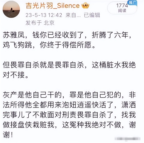 直到今年三月份,法院一审判决翟欣欣退还660万人民币,外加汽车等各种房产,直到这时候她才后知后觉这件事将会变的棘手,自从苏享茂去世后,翟欣欣就没有登陆过任何社交平台,但为了能给自己洗白,她注册了一个全新的账号。