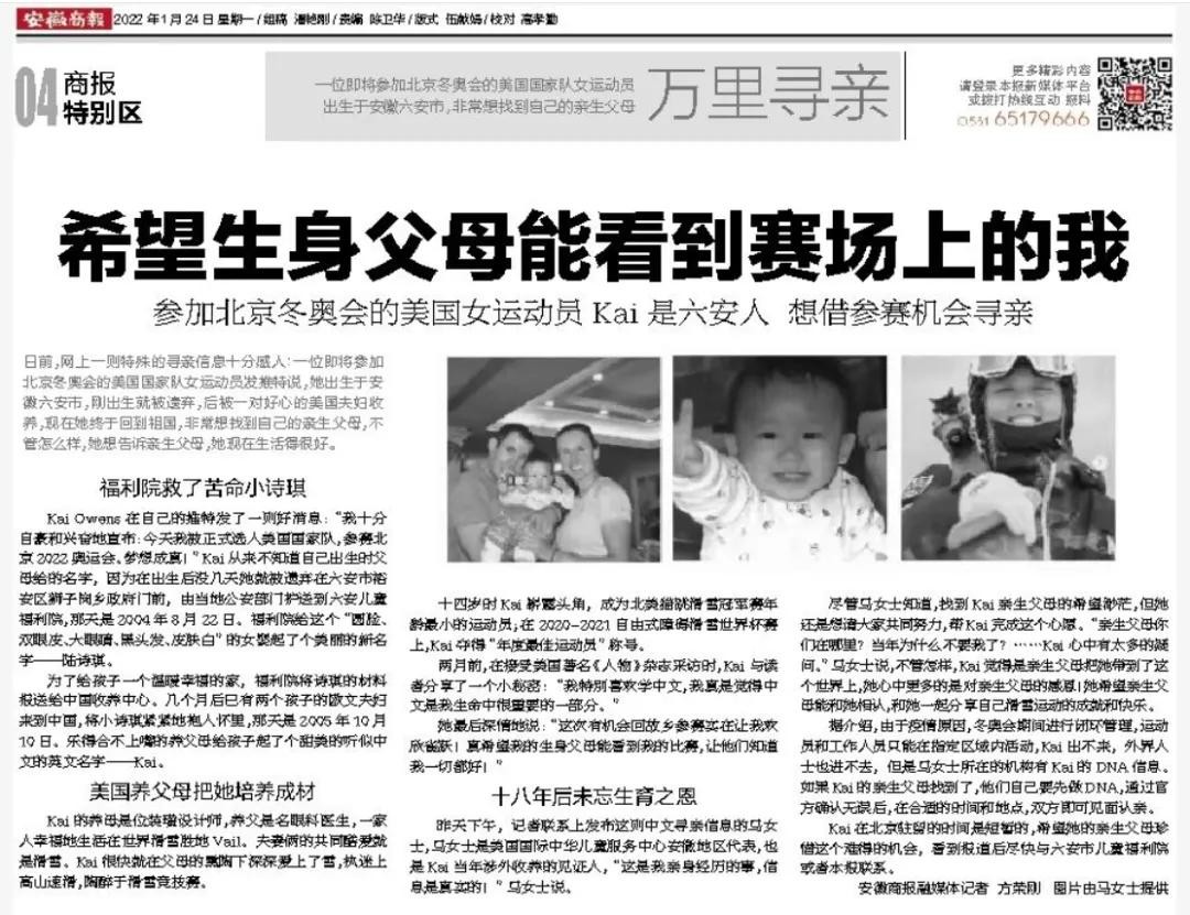后来《安徽商报》还刊登了陆诗琪借北京冬奥会寻找亲生父母的新闻,希望亲生父母能够看到她的比赛,知道她一切安好。