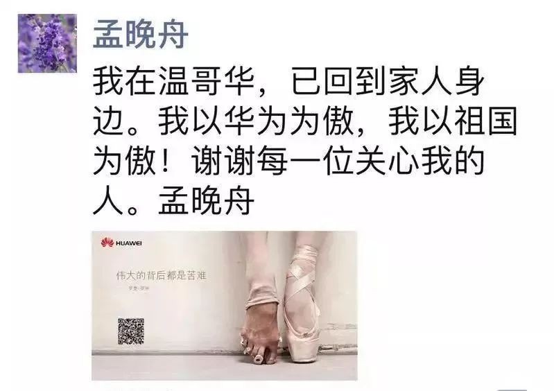 “我在温哥华,已回到家人身边。我以华为为傲,我以祖国为傲!谢谢每一位关注我的人。”