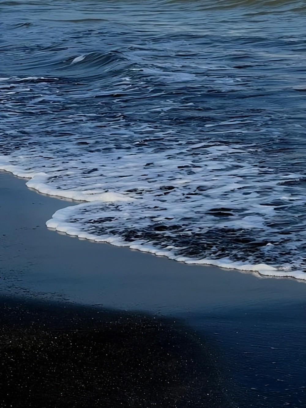 站在沙滩上,看着巨大的海浪拍打着岸边,黑色的沙滩与灰色的天空相互映衬,给人一种既荒凉又神秘的感觉。