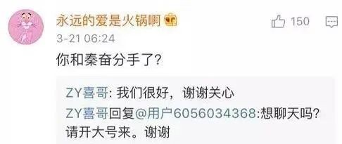 阿娇和秦奋的恋情发酵以后,有网友去喜哥微博下面求证,喜哥迅速摆明了自己正宫的身份。