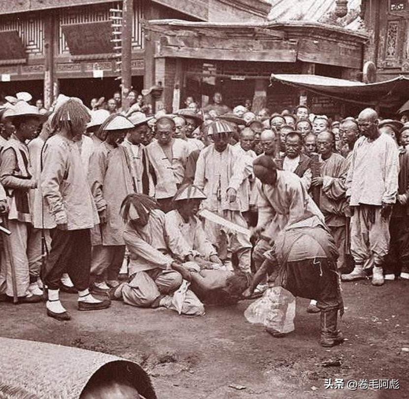 有的只是照片中赤裸上身的男子被两名官兵死死的按在地上,前面还有一个官兵摁着他的脑袋,防止他胡乱挣扎,刽子手则拿着砍刀准备挥向囚犯的脖子。