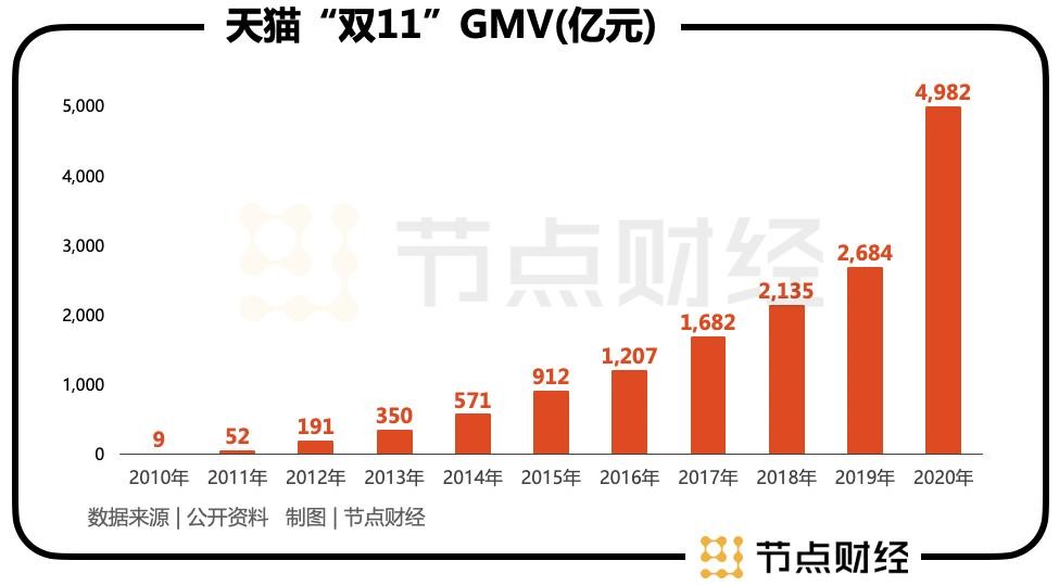 2012年,天猫(原淘商城)“双11”GMV突破100亿元,2016年突破1000亿元,2018年突破2000亿元,2020年大踏步跨到近5000亿元的关口。