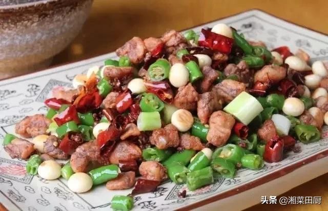 3、锅留底油,下入干辣椒节、花椒、姜片、蒜片和尖椒颗炝炒出香味,放入炸过的猪脆骨丁,调入盐、鸡精、味精和白糖炒匀,撒入旺仔小馒头和大葱颗颠匀,出锅装盘,即成。