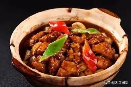2、净锅上火放油,先下姜片、葱节、干辣椒节和猪五花肉块,爆炒出油后烹料酒,掺入煮肉的原汤,另外加放盐、红烧酱油、蚝油、海鲜酱、冰糖色、盐、香料和刺梨干,待慢火煨至熟透时,放鸡精、味精并推匀,见其收汁后,再装砂煲里上桌即可。