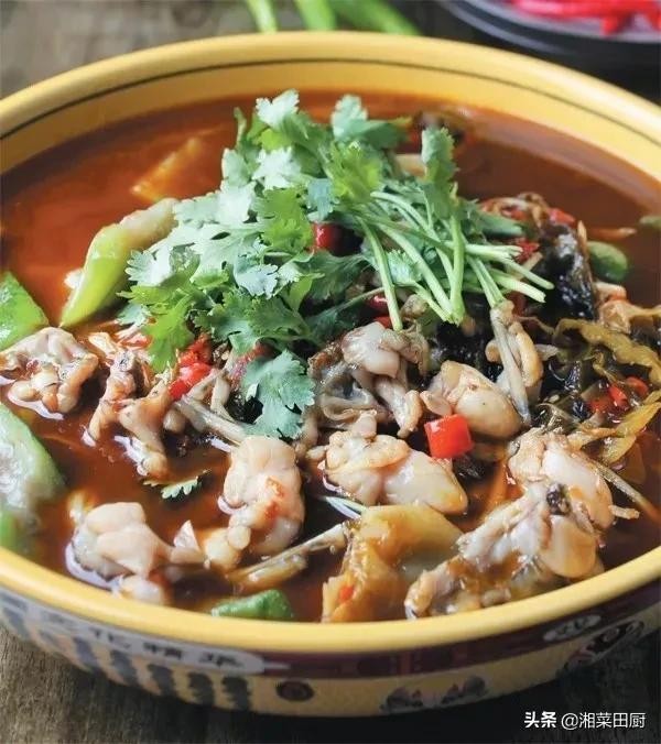 3、锅洗净重新上火,放菜油烧热,下泡酸菜片、泡萝卜片、泡姜片、泡小米椒节、泡豇豆节和姜蒜米炒香,掺入鲜汤烧开,下入牛蛙块,加味精、鸡精煮熟,淋香油、藤椒油后,起锅舀在垫有底料的土钵内,撒上香菜节即成。