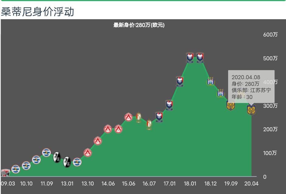 桑蒂尼最高身价的时候是他效力与卡昂,那时他作为球队的攻城锤帮助球队连番进球可是立下了汉马功劳,这也让他的身价一度上涨到500万欧元。而加盟了江苏苏宁之后桑蒂尼身价尽管降到了280万欧,但其实这影响不大,球员的身价只能说是一个参考他能力的因素,但不是决定条件。出场10场便能够帮助江苏苏宁打进了6球,苏宁花了500万将他买入其实也是物超所值了。贵不一定等于好用,性价比高才是最好的,而桑蒂尼这样的类型球员则是性价比非常高的球员。