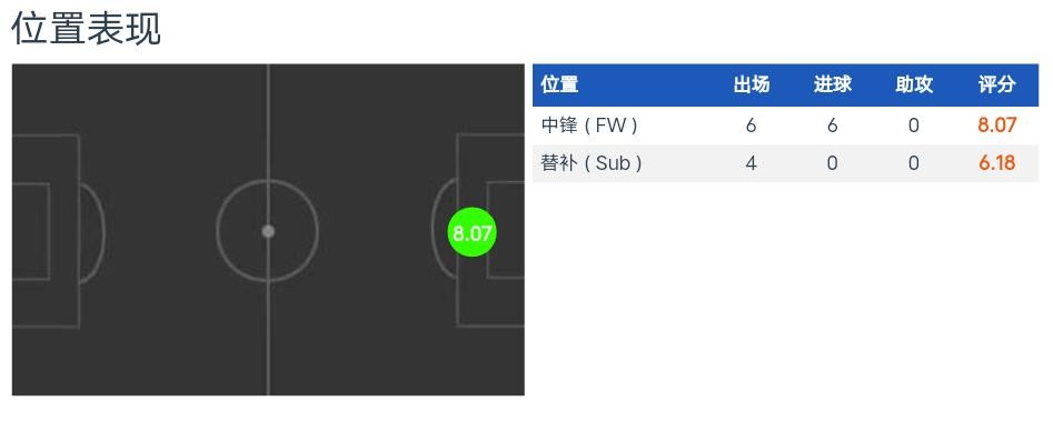 从上图可以知道,桑蒂尼在中锋这个位置表现是非常之不错的,上赛季他替江苏苏宁首发出场6场6场这个位置则是帮助球队打入了6球,评分高达8.07。可见随着这位高大中锋的加入可以说直接填补了江苏苏宁在中锋位置上的空缺,丰富了球队的打法。