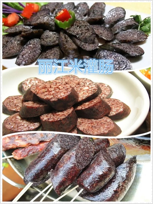 黑米灌肠是将蒸到九成熟的糯米,加上猪血浆、盐巴、茴香籽和花椒等几种佐料搅拌均匀后,灌到猪肠子里,用蒸锅蒸熟;而白米灌肠则是将猪血浆换成鸡蛋清,蒸熟后就是白米灌肠了。米灌肠蒸熟后,不论怎么吃,都很爽口,是纳西族请客时必不可少的食品。