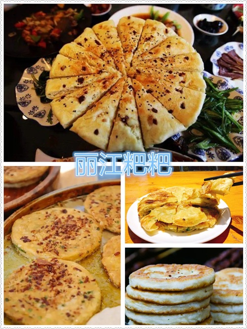 丽江粑粑分为咸甜两类,可以根据各自口味任意选用。烹制好的丽江粑粑外皮金黄,,香味扑鼻,入口浓香酥脆,是老少咸宜之佳品。有的加喝酥油茶,更是其味无穷。