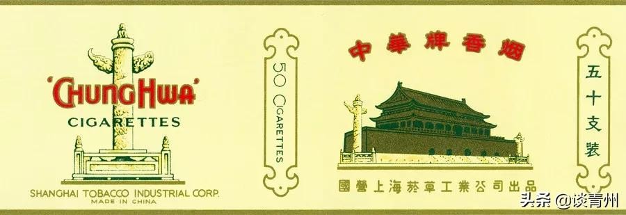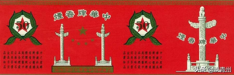 商标纸采用中国传统的大红色,天安门前的大华表中间是按国旗图案的五颗五角星,大写的50镶着绿色叶片,这个设计奠定了“中华”这一写入历史的品牌形象。