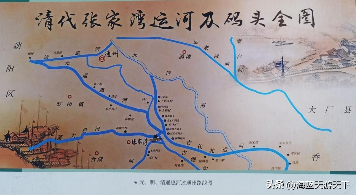 通惠河,元代由郭守敬主持修建。自至元二十九年(1292年)开工,至元三十年(1293年)完工,最早开挖的自昌平县白浮泉经瓮山泊(昆明湖)至积水潭(什刹海)、中南海,自文明门(崇文门)外向东,在朝阳区杨闸村向东南折,至通州高丽庄(张家湾村)入潞河(北运河故道),全长82公里。元世祖忽必烈将此河命名为通惠河。在历史上,通惠河是北京地区漕运业最发达的水道,对建设北京、繁荣经济曾发挥了极重要的作用,曾是北京的一条经济命脉。