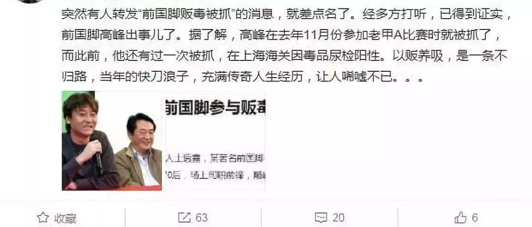 4日,有未经证实的消息称“某前国脚涉毒”被抓。随后,有人在微博上爆料出事的人是曾效力国安等球队的快马高峰。微博中还爆料称,去年11月份参加老甲A比赛前,高峰就出事了。