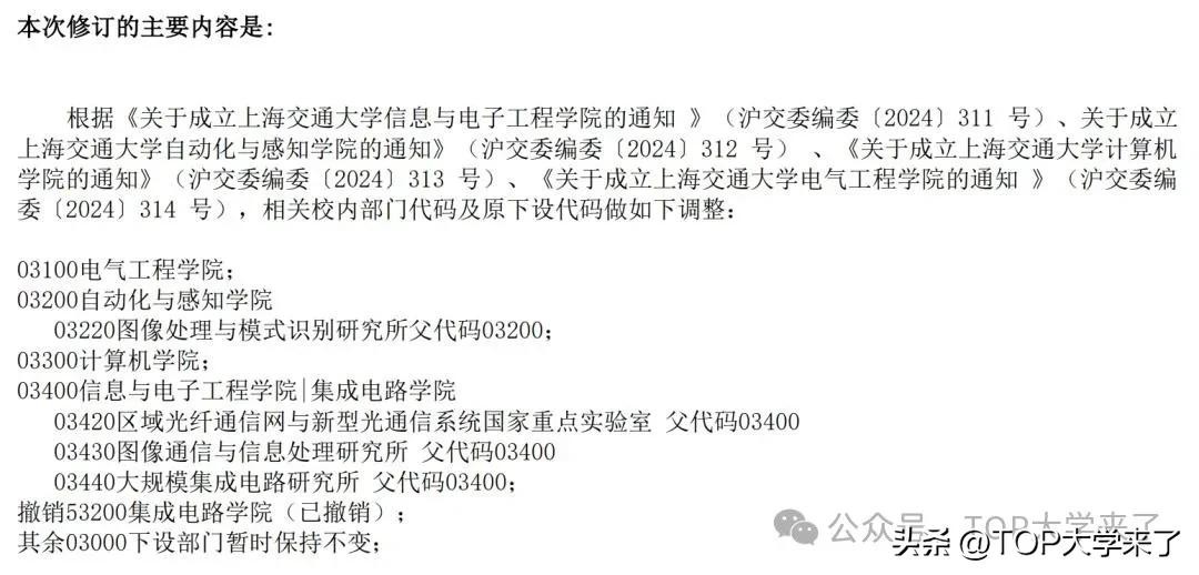 同一天(2月17日),上海交通大学信息公开网更新校内单位代码文件,原电院的多个系迎来重大转变:电气工程系升级为电气工程学院;自动化系变为自动化与感知学院;计算机科学与工程系将以计算机学院的全新身份亮相;电子工程系更名为信息与电子工程学院 | 集成电路学院。同时,部分研究所的父代码也有相应变动,原集成电路学院已撤销。