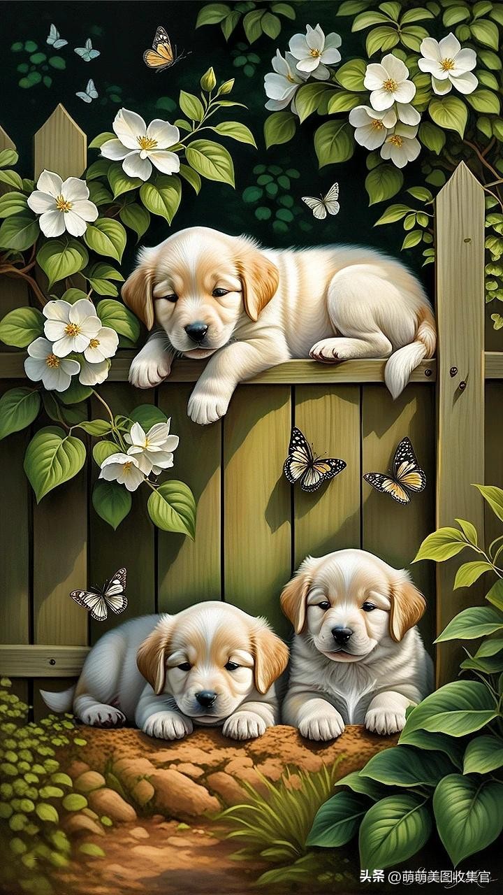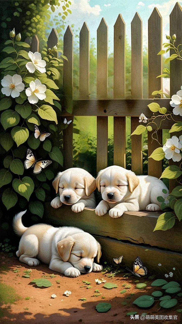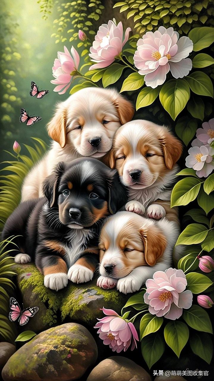 在这宁静的午后,可爱的狗狗们正悠然自得地享受着它的时光。它们身处一片缤纷的花影间,沐浴在温暖而和煦的阳光下,静静地闭上了眼睛。