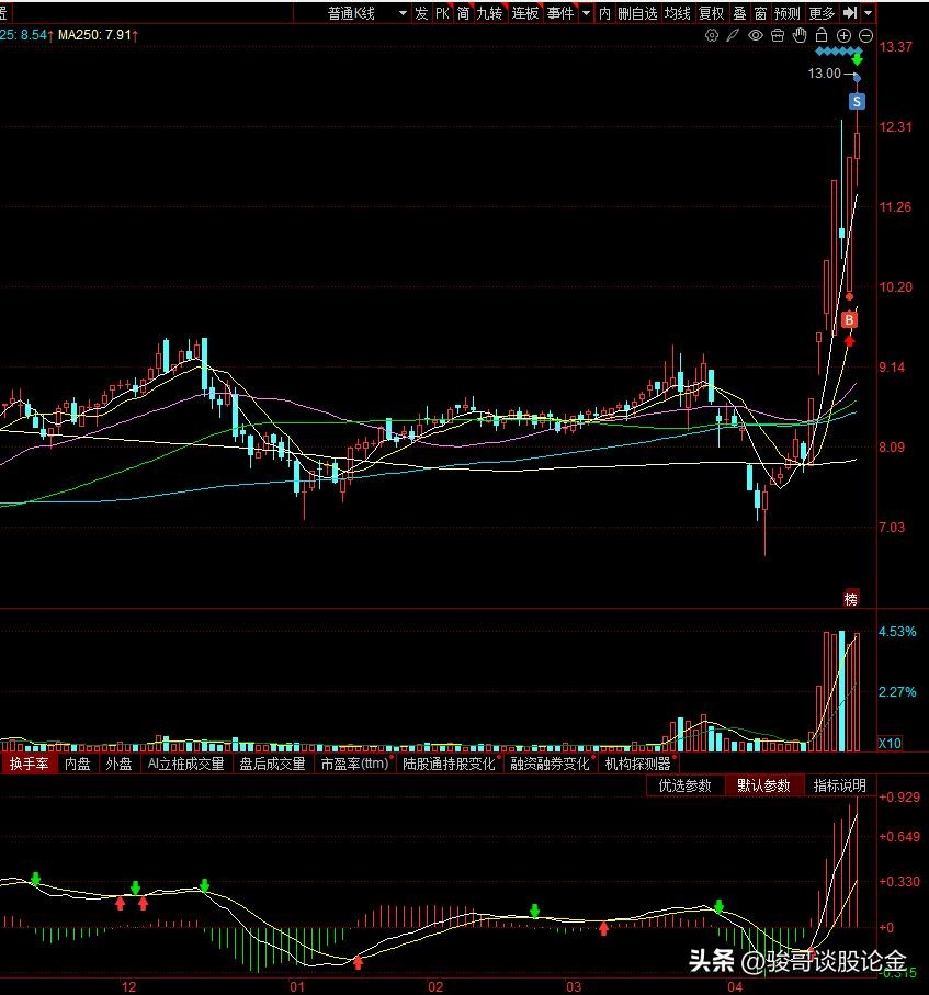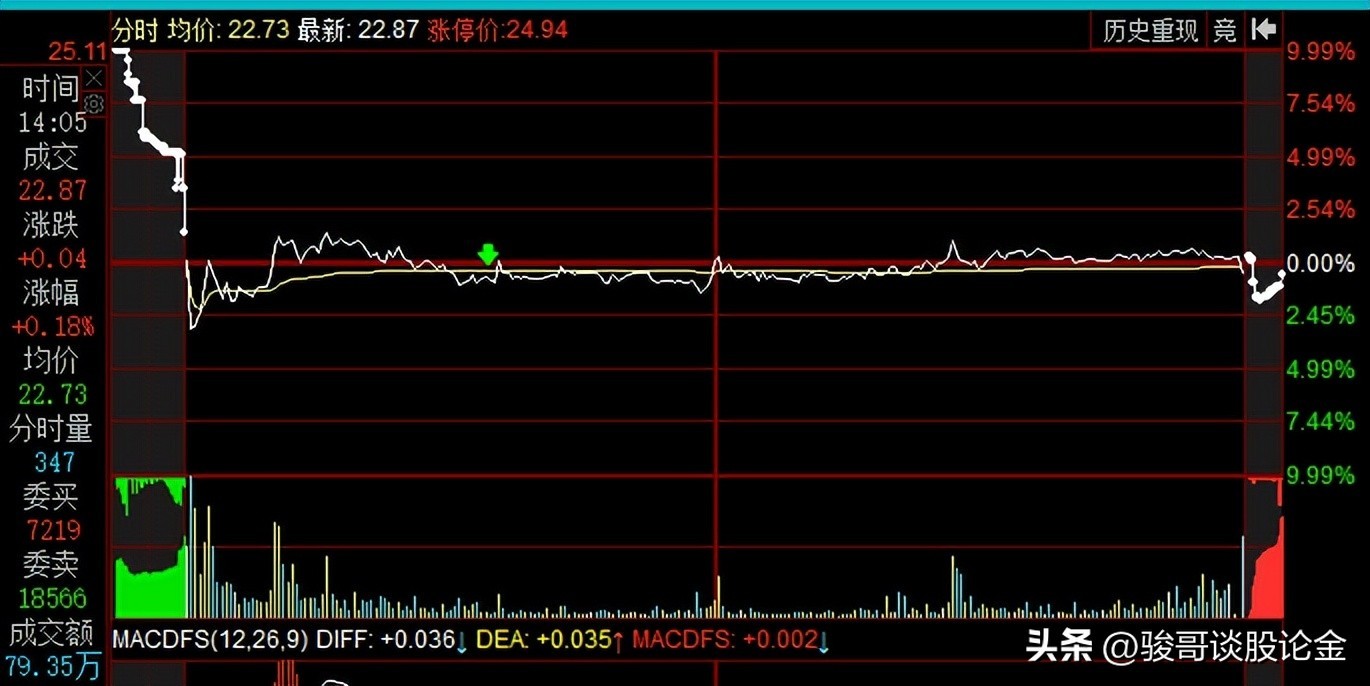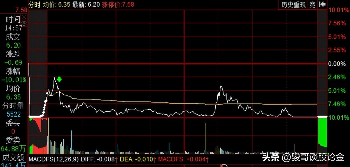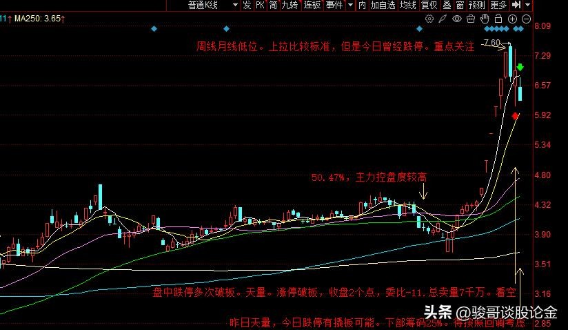 当天他集合竞价跌停,很快就抬头逼近水面,但是开盘后反而持续下跌,直到跌停。然后就是不断的破板。这只票我早盘一直都在关注。中午我打瞌睡,睡过了头,等我老婆喊我起床,一看,他就已经突破均线,开始上拉了。我连忙追高在这个点买入。后面这只票上拉涨停,但是很快破板回调,收盘2个点。到这里这只票就很不乐观了。下一日大概率看空。