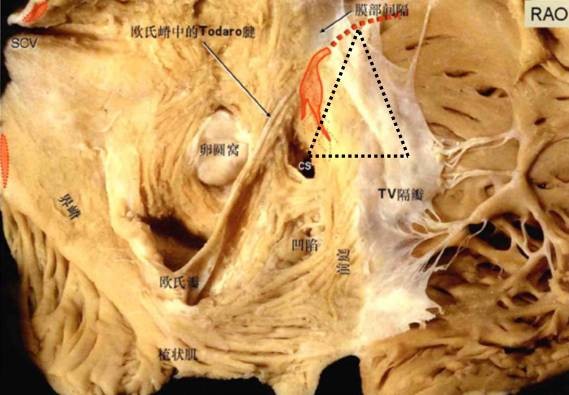 图中的右房心内膜已去除,黑色虚线三角区域即为koch三角。 Cs=冠状窦 TV=三尖瓣 RAO=右前斜位