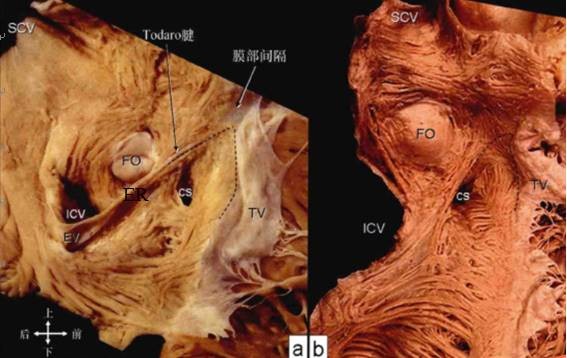 下图(a)可以看到,EV的游离缘Todaro肌腱走行在ER肌样结构中。图(b)是切开心内膜下显示各结构。
