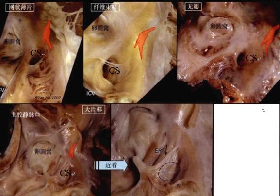 冠状窦(CS)口:冠状窦,位于冠状沟 内,由心大静脉延续而成,以冠状窦口开口于右心房,它收纳心壁的绝大部分静脉血,它的属支主要有心大、中、小静脉。冠状窦口在临床电生理上是推送冠状窦电极的入口,在其前方有不同形态的冠状窦瓣。有时临床做电生理送冠状窦电极时常常感觉有阻力,就可能是碰到了这些“看门”瓣了。