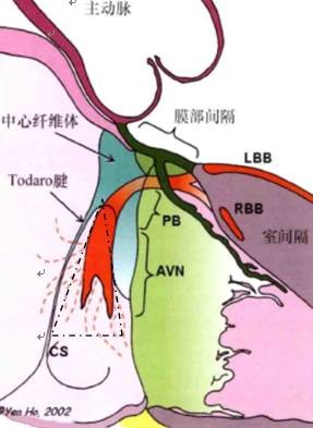 上图中,Koch三角(黑色虚线三角)的顶点就是 中心纤维体(蓝色的区域),从图中可以看出,Todaro肌腱连接到中心纤维体,AVN(橘红色)位于中心纤维体的正下方且向下方发出两个延伸支由移动细胞(红色虚线)包绕,AVN往前是希氏束的穿间隔支(PB),再远处的共同房室束分为左右束支(LBB,RBB)