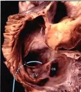 上图为欧式瓣图例,蓝色虚线是从下腔静脉进入的导管,EV=欧式瓣ER=欧式嵴CS=冠状窦 TV=三尖瓣