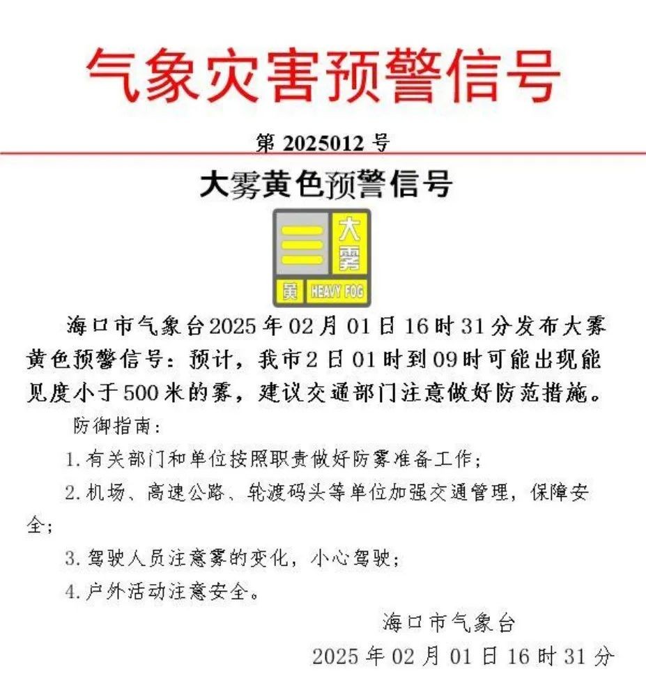 预计,海口市2月2日1时到9时可能出现能见度小于500米的雾,建议交通部门注意做好防范措施。