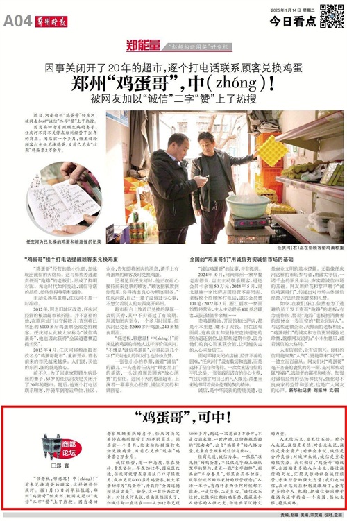 “任老板,够意思!中(zhóng)!”前来兑换鸡蛋的顾客,这样评价任庆河。据1月13日新华社报道,郑州“鸡蛋哥”任庆河,被网友冠以“诚信”二字“赞”上了热搜。因为要回老家照顾生病的妻子,任庆河决定关停在郑州经营了20年的商店。闭店前一个多月,他主动给顾客打电话兑换鸡蛋,目前已兑出“过期”鸡蛋票2万余斤。