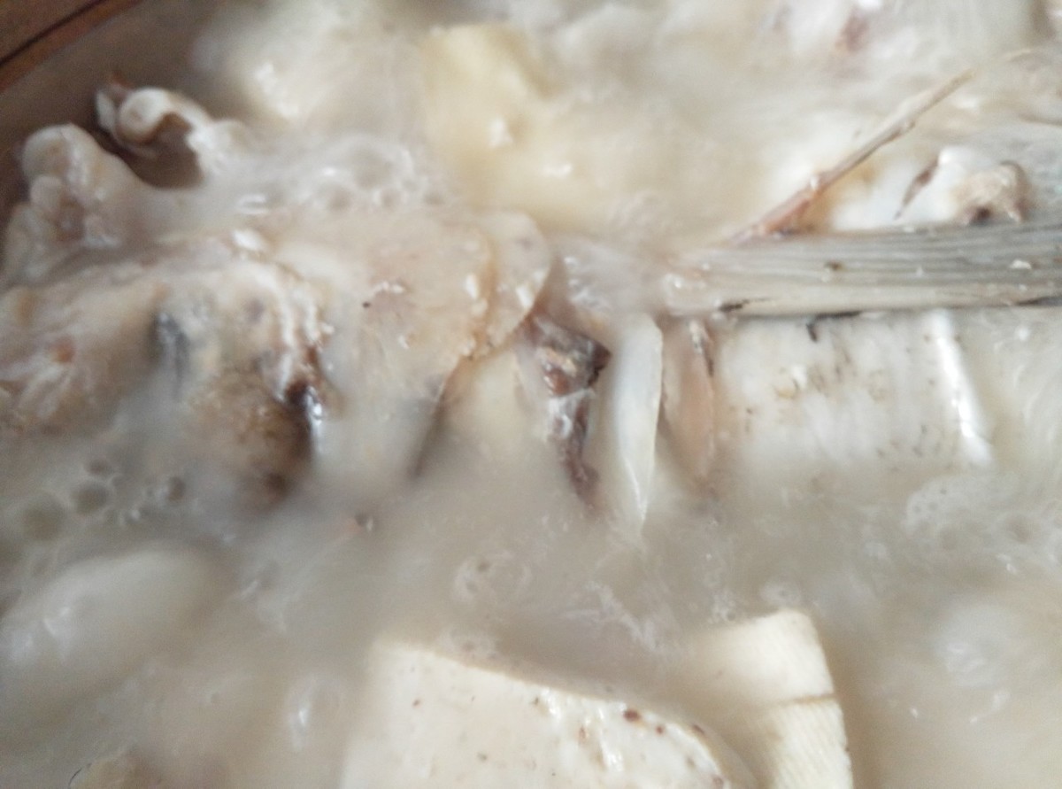 鱼煎的差不多后要加水了,注意一定要加开水进去,一来可以减少煮沸的时间,二来也有利于能让汤色变白的乳化反应的进行。加水后直接大火煮直到汤水发白为止,之后再转中火熬到汤水浓白即可出锅。鱼肉可不像猪大骨、猪排骨那样耐煮,可以小火慢慢熬煮,鱼汤一旦煮的太久了鱼肉很可能就烂在汤里了。