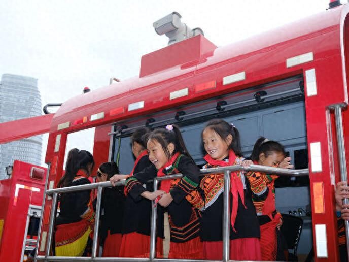 11月16日,四川成都,一群来自大凉山的孩子兴高采烈地登上了消防车,开心地在车上拍照留念。当天,这16名来自四川省凉山彝族自治州的孩子和支教老师特地前来参加“119”消防宣传月活动,在四川省森林消防总队特勤大队展开了一次别开生面的学习之旅。活动中,他们不仅学到了有关消防安全的知识,还深入体验了消防员的工作和日常生活。