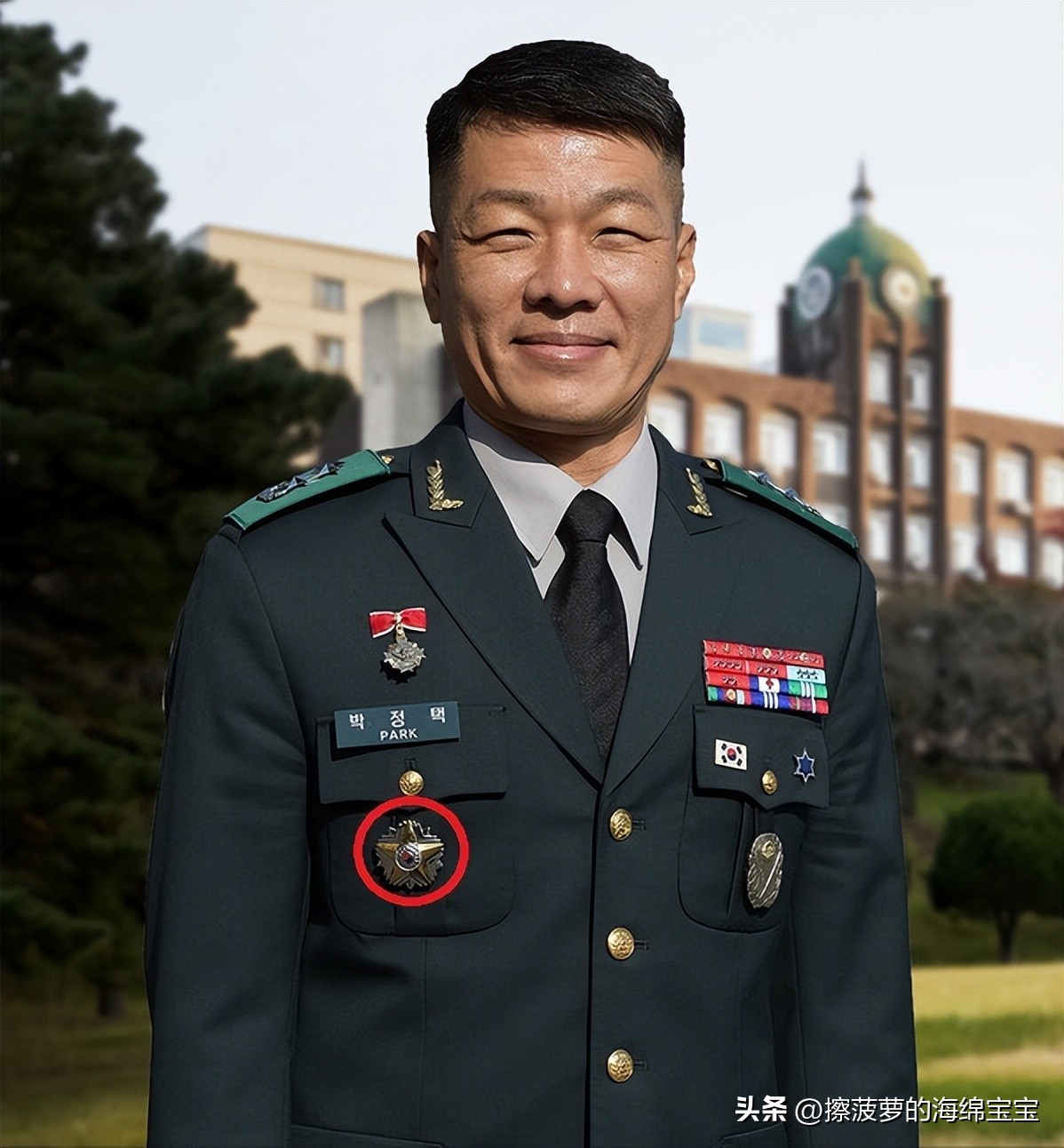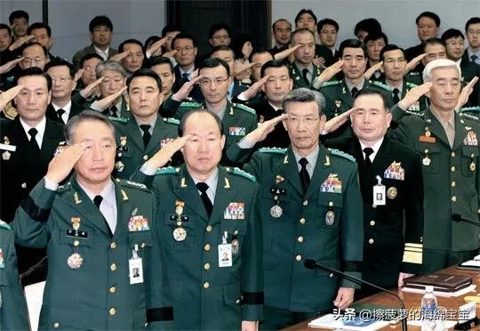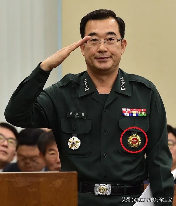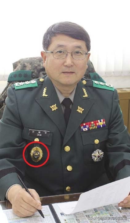 中间戴白色口罩的是前地上作战司令官全东镇上将,他佩戴一枚作战司令官徽章