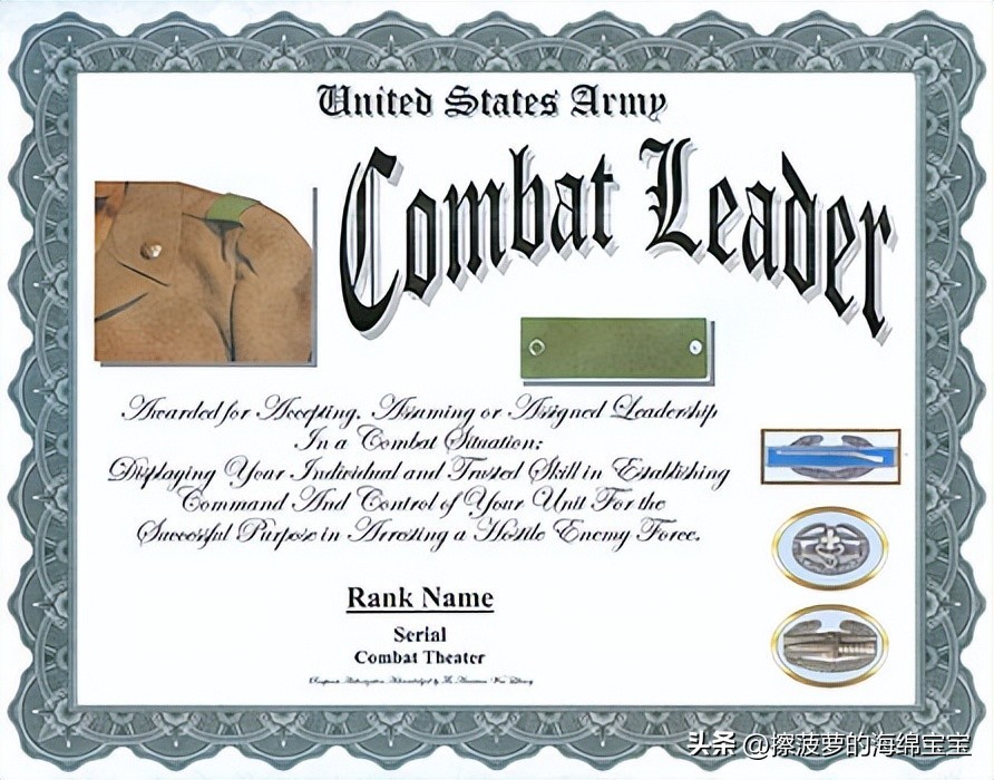 1992年版美国陆军服装和装备标准AR 670-1规定:作战领导识别标签由第一类部队(装甲,步兵,战斗工兵,野战炮兵,防空兵和航空兵)和第二类(突击直升机)的指挥官佩戴。