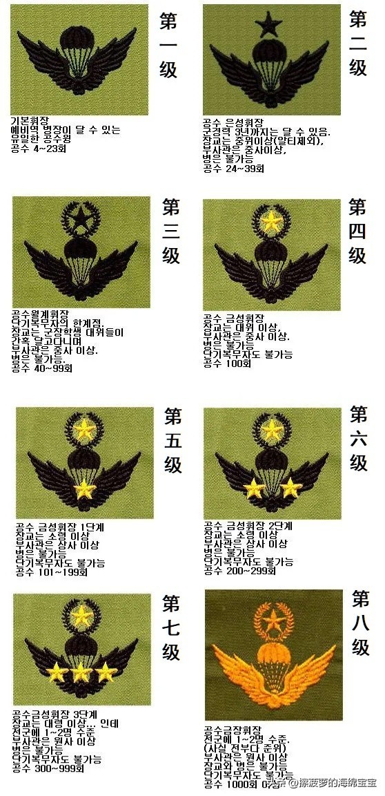 ●第八级:完成1000次实战空降授予,该级别只授予特种部队人员。